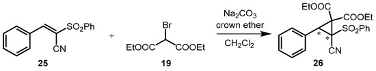 MIRC-reaction of (E)-3-phenyl-2-(phenylsulfonyl)acrylonitrile (25) and diethyl bromomalonate (19).