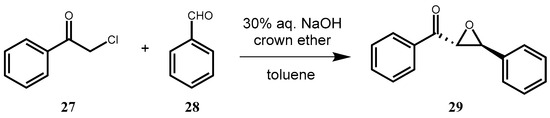Darzens condensation of 2-chloroacetophenone (27) and benzaldehyde (28).