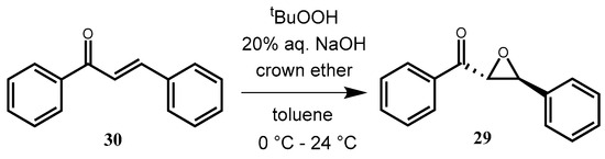 Another liquid–liquid two-phase reaction was the epoxidation of trans-chalcone (30) (Scheme 11), which was reacted with tert-butyl hydroperoxide under basic conditions to afford epoxyketone 29.