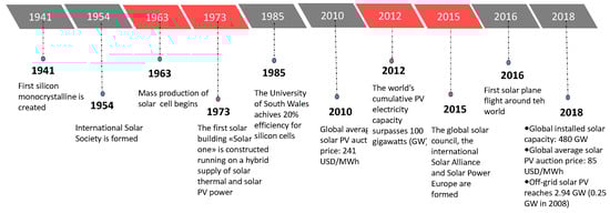 PV directly converts solar energy into electricity and therefore offers a sustainable answer to the increasing global energy demand. The solar PV industry has evolved remarkably. Milestones in the field are reported in Figure 1.