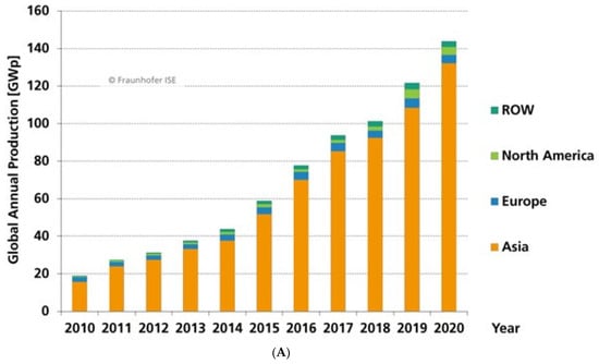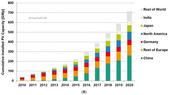 (A): PV module production per region; (B): global cumulative PV installation [4].