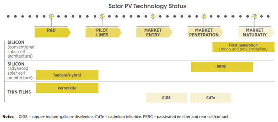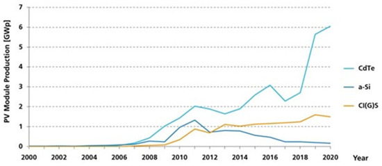 CdTe cells achieved an efficiency of 22.3%, very similar to that of CIGS, and were characterized by good absorption and low energy losses [4,7]. Historically, there are two large categories of CdTe PV devices on the basis of substrate deposition temperature: low temperature (<450 °C) and high temperature (>450 °C). Low substrate temperature (LST) CdTe makes production very flexible and affordable thanks to lower energy consumption, lower substrate stress, a larger choice of substrates, and the possibility of substituting glass with polymers for flexible solar devices [7]. CdTe currently has the largest market share of all thin-film technologies [18] (Figure 6).