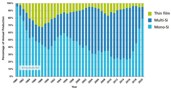 The cost of silicon rose around the years 1988 and 2006 owing to its increased demand, resulting in increased interest for more economic, even though low efficient, thin-film technology for large-scale power generation (Figure 4). However, a different trend occurred a few years later, in 2012, i.e., the production shifted towards c-Si technology due to the falling silicon prices, whilst the overall market share of thin-film technologies was constantly decreasing (Figure 4).