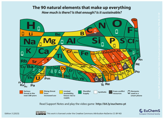 Possible options to overcome the issue of rising demand for a given hitchhiker are: (i) the expansion of the rate of production of the major attractor metal, which for Te and In are Cu and Zn, respectively (Table 3); (ii) substitution with alternative materials; (iii) the improvement of the extraction efficiency of the minor by-product from the base metal ore; and (iv) finding alternatives, and above all independent sources of the critical metals. The first option in the case of Te and In concerns the production of Cu and Zn. Currently, both these elements are not abundant (Figure 5) at different levels: Cu has “limited availability, future risk of supply” and zinc shows “serious threat in the next 100 years” (Figure 7).