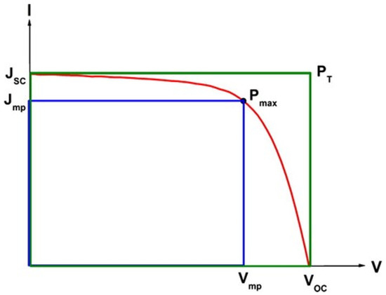 The conversion efficiency of light into electrical power is defined as the ratio of the output electricity to the input energy of sunlight. In practice, the PCE (η) of a solar cell is defined as the ratio of the maximum power output, Pmax, generated by the solar cell to the power input, Pin, based on the measurement of current density and voltage (I-V) curve (Figure 9) [51]: