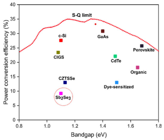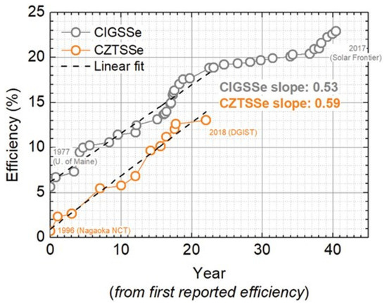 Recently, CZTSSe solar cells have achieved the highest efficiency of 13% (Table 4, entry 6), which is still far from that of its counterpart CIGS, i.e., 23.6% (Table 4, entry 4). CZTSe has a band gap energy of 0.95–1.0 eV. CZTSSe has a tunable band gap, which depends on the S and Se ratio, in the range 1.4–1.5 eV, close to the optimum single-junction value predicted by the Shockley–Quessier model (Figure 10) [50].
