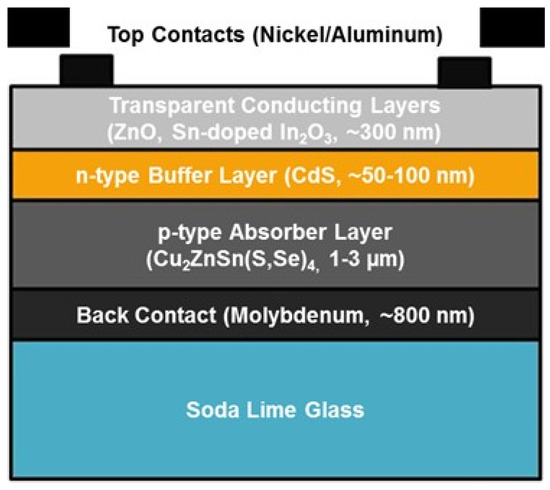 A conventional CZTSSe solar cell has an asymmetric structure, as schematized in Figure 11. There are three interfaces: (i) back interface, i.e., Mo (hole transport layer)/CZTSSe (absorber layer); (ii) front interface, i.e., CZTSSe (absorber layer)/CdS (electron transport layer); and (iii) CdS (buffer layer)/i-ZnO/AZO (window layers) interface. The front and back contact interfaces are crucial for charge carrier separation, collection, and recombination.