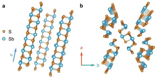 Schematic diagram of quasi-1-dimensional structures of Sb2S3. (a) Side view and (b) top view of [Sb4S6] ribbons along the c axis. Reproduced from [116] under CCBY 4.0.