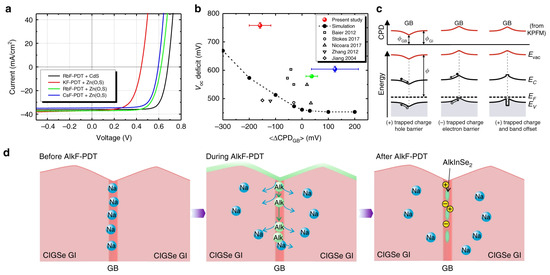 The effect of grain boundaries in solar cell devices. (a) J–V characteristics of reference solar cells for the CIGSe layers with different AlkF-PDT; (b) open circuit voltage deficit with respect to the respective band gap as a function of the potential change at the GBs for the three studied samples (large colored circles) and for some results taken from the literature; (c) schematic band diagrams (lower panels) and expected CPD as measured by KPFM (upper panels) for a GB with a hole barrier (left), an electron barrier (middle) and an electron barrier with a band offset (right); and (d) schematic of the PDT process. Reproduced from [138], under CCBY 4.0.