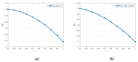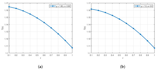 Similarly, in cases 3 and 4, when we increase the fractional parameters that nearly approach the integer, the solution profiles fall from to . As a result, the suggested fractional-order graph, which takes into account the radial distance (r), Biot number (), metabolic thermogenesis slope parameter (m), and thermogenesis heat production parameter (), provides a more accurate representation of the distribution of temperature within the human skull.
