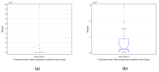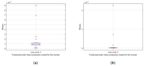 We analyzed the FO heat conduction model for the human head given in Equation (3) by using an interval of . Four different cases were considered by choosing varying values of for the fixed parameters . The approximate solutions for both cases, 1 and 2, are presented in Figure 3. These graphs show that when we decrease the order of the fractional parameters from an integer order to a non-integer, the temperature profile jumps to from . A decreasing trend is observed when . This trend is more sharp in the integer order when compared to the fractional order. The fitness of the functions is shown in Figure 4, where the red lines show the mean. Almost all the values are bounded by the box, and the distance from the mean positions is displayed on the vertical line.