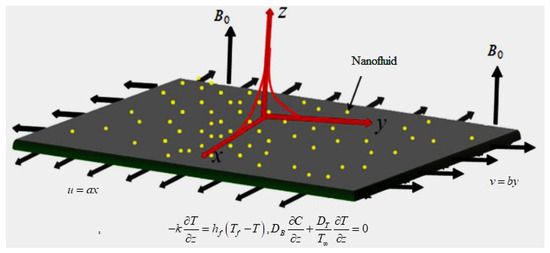 A three-dimensional Darcy–Forchheimer model considering two-phase nanofluid flow via an elongating surface through a permeable medium is proposed in this article. The flow is supposed to move in both directions of the stretching sheet, imposing the cross-diffusion effects. Additionally, the effect of a chemical reaction with the convective heat transfer and zero nanoparticles flux are introduced at the boundary which enriches the profile. The configuration of the system is arranged such that the and axes align with the surface’s stretching direction, while the axis is perpendicular to it. The velocities corresponding to the stretching direction are denoted as along the axis and along the axis. The convective heat process suggests the transport coefficient as and considered as the surface temperature with hot fluid (Figure 1). Following Muhammad et al. [25], the modelling of the physical problem is described as