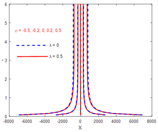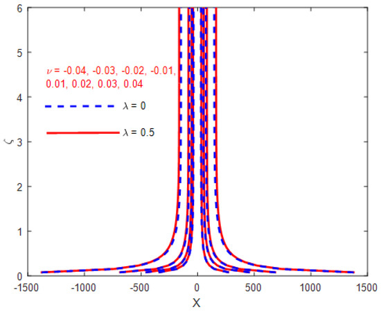 Figure 2 and Figure 3 show the plots for the streamlines due to the use of stream function and the kinematic viscosity in the considerable c of the porous matrix, respectively. These plots represent the flow pattern of each particle within the domain. In particular, the difference between the values of stream function at any two points declares the volumetric rates through a line. It also indicates the tangent to the flow velocity where the values of the stream function should be constant along a streamline. An interesting observation is that with the variation of the stream function and the kinematic viscosity, the intensity of the nanofluid enhances on the stretching surface with a stagnation point marked at . Further, the sharpness observed towards the free stream increases from the stagnation point. The flow through a permeable medium also shows a greater deceleration and therefore the amount of sharpness increases significantly.