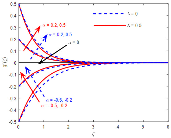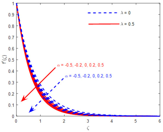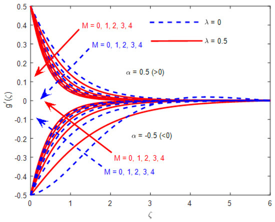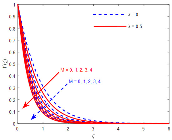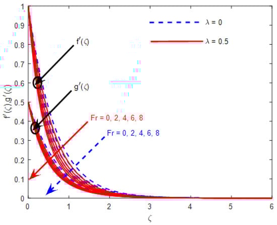 Figure 8 portrays the role of Darcy–Forchheimer inertial drag on the axial as well as transverse fluid velocity distribution with the interaction of a porous matrix. To describe the micro-structural behavior in the pore fluid flow, this drag effect is considered. As discussed earlier, the application of inertial drag is important in mechanical studies; for example, contemplate situations involving hydraulic fracturing, where a fracking fluid is injected into a porous rock to initiate a fracture. In such instances, a Darcy-like pore fluid behavior arises within the porous matrix, transitioning to a Navier–Stokes-type flow at the surface [35]. It reveals that enhanced drag controls the fluid velocity; therefore, in both cases it decelerates smoothly. Further, the presence of a porous matrix enhancing the amount of retardation is greater in comparison to the flow through a clear fluid.