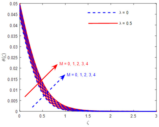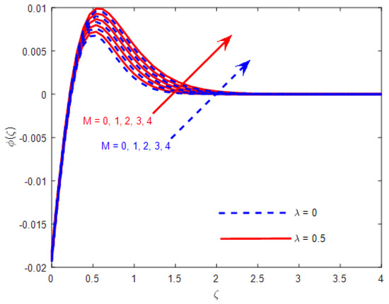 The applied transverse magnetic field causes the fluid to become magnetized and the impact is due to the force that is created by the magnetic dipole as well as the movement of electric charges. This impact also termed as an electromagnetic effect and it exerts a force near the moving charges and magnetic dipole. Figure 4 illustrates the characteristic of the magnetic constraint affecting the axil velocity profile for the occurrence of a permeable/impermeable medium. Here, in each description (dotted line) indicates the clear fluid region and (bold lines) presents the flow via a permeable medium. The interaction of the magnetic field gives rise to produce a resistive force in terms of Lorentz force, which renders an opposing or resistive force for which the velocity decelerates regardless of whether the medium is porous or the flow is through a clear fluid domain. This exhibits a strong retardation in surface thickness, which results in the velocity attenuating asymptotically. The analysis of the magnetic effect indicates that the non-magnetized fluid has a more significant impact on enhancing fluid velocity compared to the magnetized fluid. This suggests that the application of a magnetic field plays a crucial role in industrial production processes. Furthermore, the introduction of a porous matrix reduces fluid velocity to a greater extent compared to the flow through a clear fluid domain. Figure 5 illustrates the impression of magnetization on the transverse velocity distribution in various situations of the velocity ratio parameter (). The study also comprises the impact of porosity on the flow profiles. Here, suggests the expanding surface and indicates the contracting surface. When the sheet is stretched, it remains entirely within the positive domain. However, in the case of contraction, it occurs within the negative domain. This indicates that in both scenarios, the thickness of the flow profile decreases towards the bounding surface, which hinders the transverse flow velocity. The permeability of the medium also follows a similar pattern in influencing the velocity distribution. Figure 6 illustrates the combining property of magnetization with a porous matrix on the heat transfer profile. The retarding effect of both the parameters on the velocity distribution reveals that the energy is stored near the surface region and this exerts a greater upsurge in the heat transport phenomenon; therefore, the stored energy gives up and the fluid temperature increases significantly. Although the variation due to a porous matrix is insignificant in a close observation, it is seen that the permeability of the medium renders the maximum temperature within the domain. Figure 7 illustrates how the magnetic parameter changes across the distribution of nanofluid concentrations. A sharp increase in the profile is evident until the point where , after which the profile gradually levels off. With increasing magnetic parameter values, the profile consistently improves across the entire range.