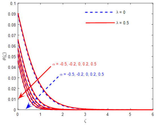 Figure 9 describes the velocity ratio on the Darcy–Forchheimer flow of nanofluid velocity distribution due to the impact of a porous matrix. The observation takes a significant attenuation in the velocity distribution for the increasing positive velocity ratio parameter whereas the impact is reversed for the negative values. Figure 10 exhibits the characteristic of the velocity ratio on the transverse velocity profile in combination with the impact of permeability. Three distinct layers of variations are presented for the various values of the velocity ratio parameter. An interesting feature is exhibited for , i.e., the profile became linear over the main flow direction. Further, the profile augments for the increasing values of the ratio parameter. The variation of positive values is exhibited in the positive domain and the negative values presented in the negative domain. In either of the cases, the flow through an impermeable medium exhibited maximum velocity in magnitude in comparison to a permeable medium. Figure 11 and Figure 12 illustrate the noteworthy traits of the ratio parameter on the temperature and concentration distributions of the nanofluid, respectively. In Figure 11, there is a gradual attenuation in the profile as the positive ratio parameter increases, while the negative ratio parameter intensifies this effect. Moving on to Figure 12, the impact of the ratio parameter on the concentration distribution is displayed. A marked augmentation in the profile is evident within a specific range, followed by a deceleration. Furthermore, an increase in the ratio parameter once again leads to a retarding effect on the concentration profile, regardless of the medium being considered.