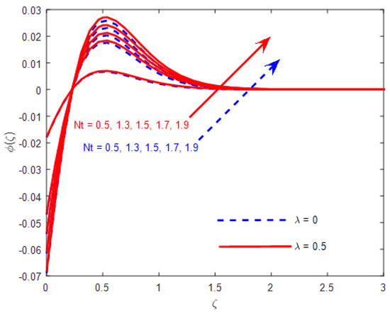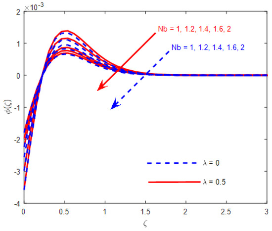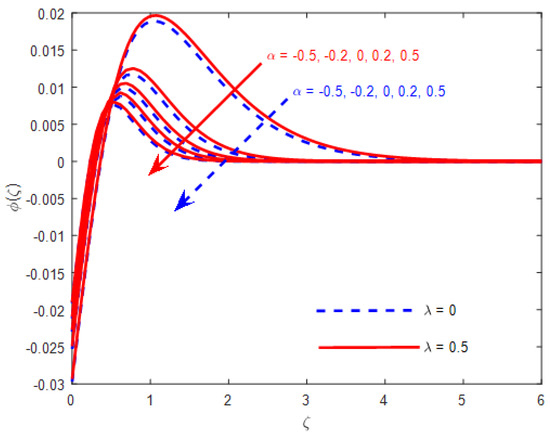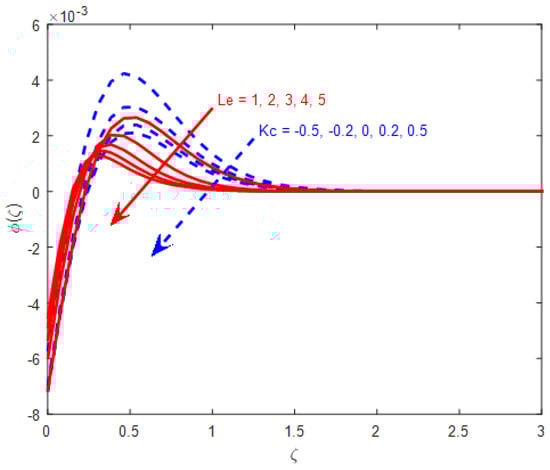 Figure 16 exhibits the impact of Lewis number as well as the chemical reaction parameter on the solutal profiles of nanofluid. The Lewis number is the combined effect of the heavier species and the Prandtl number. Mathematically, the Lewis number is the ratio of the thermal diffusivity and the Brownian diffusivity. Increasing the Lewis number is due to deceleration in the Brownian diffusivity; therefore, the concentration profile retards significantly. Here, presents the destructive chemical reaction, indicates the constructive, and suggests the no chemical reaction that validates the earlier study. The observation reveals that the increasing destructive chemical reaction retards the solutal profile while the constructive shows a reverse impact on the concentration profile.