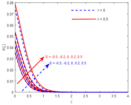 Figure 15 exhibits the impact of additional heat source/sink on the fluid temperature distribution that enhances the profile in conjunction with the convective boundary condition due to the flow through a permeable/impermeable medium. Here, S > 0 presents the behavior of source and S < 0 indicates the role of sink that affects the heat transport phenomenon. Further, the absence of heat source/sink is also exhibited in the corresponding figure. Increasing heat source exhibits the smooth enhancement in the fluid temperature whereas the opposite impact is rendered for the role of sink.