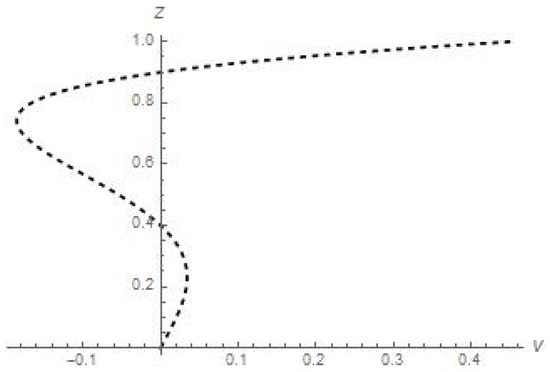 The velocity U is described by a polynomial of the ninth degree; however, the number of zero points of this speed does not exceed seven, and one of these zero points is located on the lower boundary of the layer. Similar conclusions are given for the velocity V: this polynomial of the sixth degree vanishes within the considered layer no more than three times. The corresponding profiles are shown in Figure 2 and Figure 3, respectively.