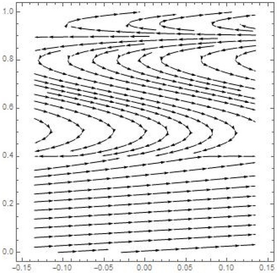 The stream function characterizes the value of the volumetric flow rate of the fluid through the cross-section of the channel built on streamlines. The curves in Figure 11 illustrate the non-uniformity of this flow rate. Consideration of both dissipative Soret and Dufour effects when describing thermal diffusion flows leads to the appearance of an additional stagnation point for the velocity field (29) and (30) if we consider the exact solutions only with the Soret effect [21] or only with the Dufour effect [51] taken into account. Thus, the competing interaction of the Soret and Dufour effects leads not only to quantitative changes for hydrodynamic fields, but also to a qualitative (topological) change in the stratification of the velocity field, pressure field, temperature field, and solute concentration field.