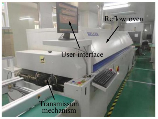 In manufacturing, the reflow oven with ten temperature zones is used. The first eight temperature zones are heating zones, and the last two temperature zones are cooling zones. In each individual temperature zone, the width (W) of the zone is 630 mm, the length (L) is 320 mm and the height (H) of the nozzle outlets to the conveyor belt is 45 mm. The nozzle outlets are arranged in the form of regular hexagons, where the horizontal spacing (D1) is 25 mm, the longitudinal spacing (D2) is 12.5 mm and the diameter of the circular nozzle is 7.5 mm. The layout of the upper and lower nozzles in each temperature zone is the same. The convoy belt speed of this experiment is 80 cm/min. The physical diagram of the reflow soldering oven is shown in Figure 6.