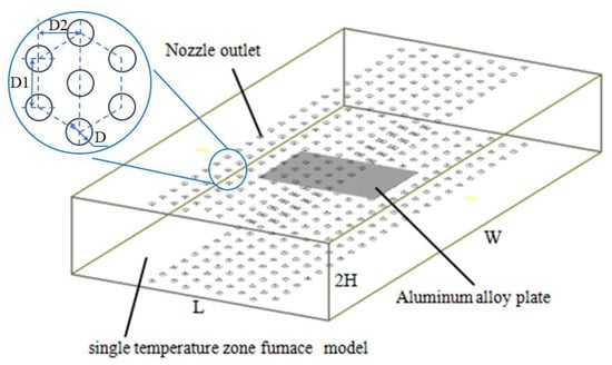 During the reflow soldering process, one motor at the top of the temperature zone and the other motor at the bottom of the temperature zone drive the fan to rotate at high speed, thereby generating air blowing force [19]. After the inhaled gas flows through the heating tube, it becomes a gas with a certain high temperature and passes through the porous cover and then blows to the PCB board. According to its heating principle, each nozzle outlet presents an impact jet process. The nozzle heating structure of each temperature zone is shown in Figure 3 [19].