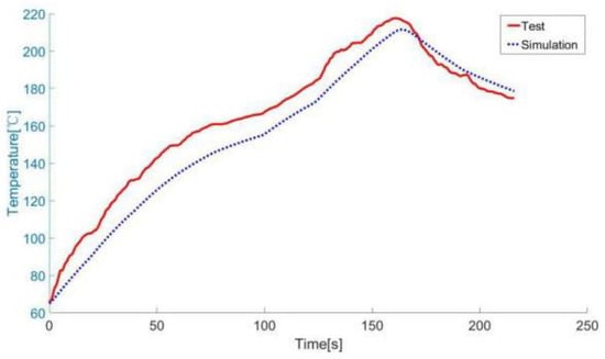 Using the Ve shown in Figure 8 as the nozzle velocity in the simulation model, the temperature field of the PCBA during reflow process is obtained. The comparative analysis of the simulated temperature and the measured temperature at the same position is shown in Figure 11 and Table 5, respectively.