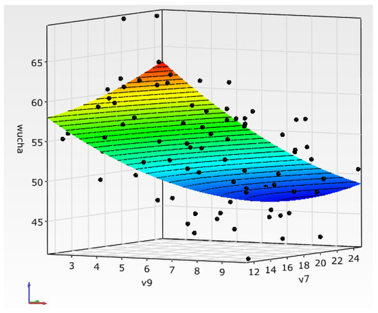 The final sensitivity results were approximated using an anisotropic Kriging model [25]. The constructed Kriging model’s prediction accuracy is 0.994436, and the determination coefficient R2 is 0.999722, which means the response surface accuracy meets the requirements. Figure 13 is a portion of a 3D response surface showing the relationship between the nozzle-matrix gas flow velocity and the Euclidean distance of the temperature data for temperature zones 7 and 9 of the 10 variables, where the gas flow velocity for temperature zones 7 and 9 are labeled as “v7” and “v9”, respectively, and the Euclidean distances of the temperature profiles are labeled as “wucha”. The color in the response surface from red to blue in Figure 13 represents the Euclidean distance of the temperature profile from large to small, correspondingly.