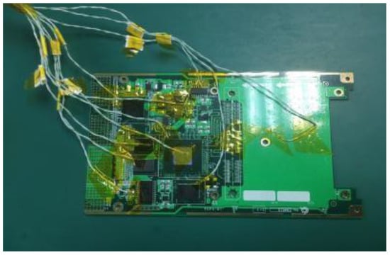 The PCB board is composed of several FR-4 materials and copper foils for electrical connection. The BGA component, several chips, resistors, and other ceramic packaged devices are assembled on the PCB board, as shown in the Figure 15. The oven temperature tester is used to monitor the temperature at some representative locations on the PCBA assembly (also shown in Figure 15).