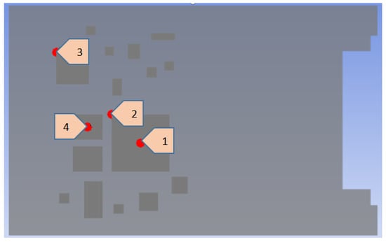 The simplified geometry model including the PCB board, components and solder paste is shown in Figure 16. Due to their small influence on the temperature field, the small-sized components are ignored or obscured in the simplified geometry model to make the CFD simulation more efficient. According to the actual test, the temperature profiles of four typical monitoring points in the simplified model are selected and shown in Figure 16.