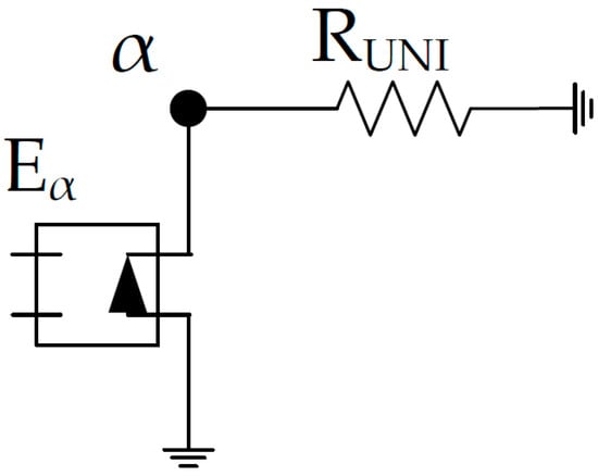 In this subsection, the network model is the same for Equation (1) as the one shown in the previous subsection, but it would be necessary to add as many auxiliary circuits as there are variable coefficients. These coefficients are implemented with a voltage source, where an equation can be entered that defines the coefficient, or so that its value is changed by a condition, etc., and a resistor of unit value. As an illustrative example, it is presented that the α coefficient is variable, as in Figure 3.