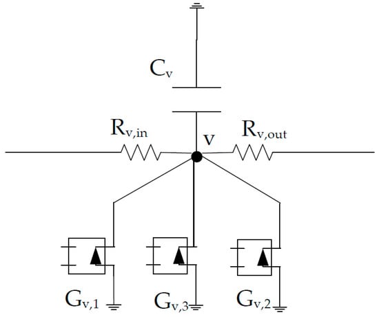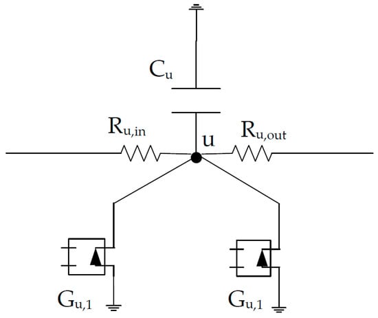 As the spatial derivative is the equivalent of the current in the NSM, a Neumann’s boundary condition can be implemented in the resistor that is not connected with another volume element in the volume element of the boundary. In the case of , it means that there is no current going outside the system, so it can be implemented using a resistor with a very high resistance (theoretically infinite). In all other cases, the resistor is substituted by a current source with a value determined by f(s, t), or f(s), if it is time-independent.