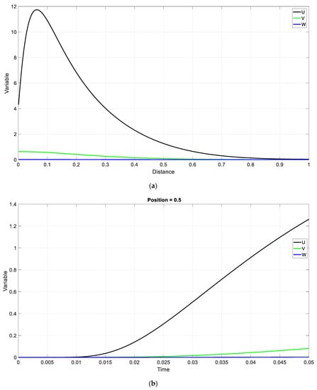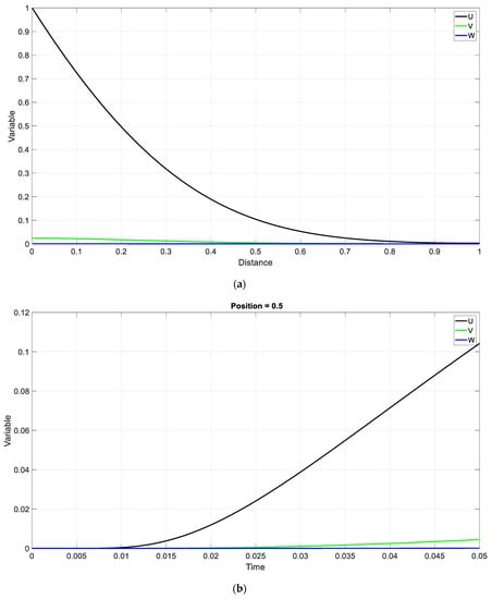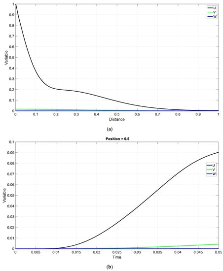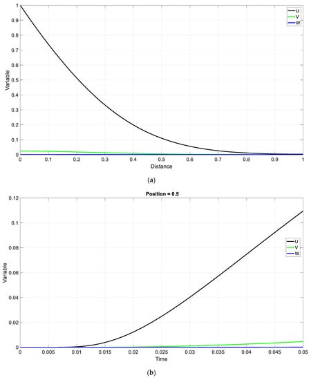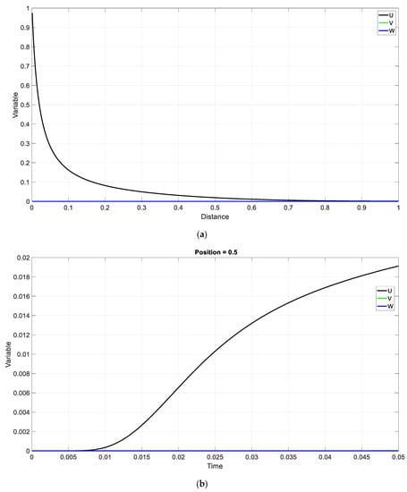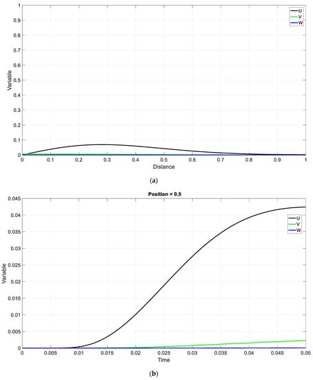 Case 14. (a) Spatial distribution of the variables u, v, and w at 0.05 s. (b) Evolution of the variables u, v, and w at a distance of 0.5.