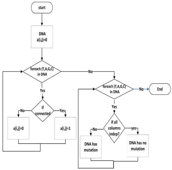Previous studies [18,19,34,35] to identify mutations depend on establishing a function and proving that it is a measurement function and require many calculations. The matroid method is easier and depends on the bonding between the nucleotides. In this section, we study a mutation with new procedure using matroids with a matrix. We created Algorithm 1 to determine the existence (or absence) of a mutation. Algorithm 1 indicates how many (A, T, G and C) elements there are; through Algorithm 1, the gene sequence was converted into a matrix.