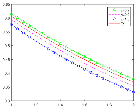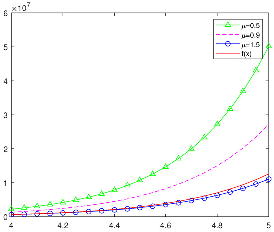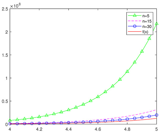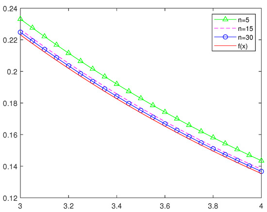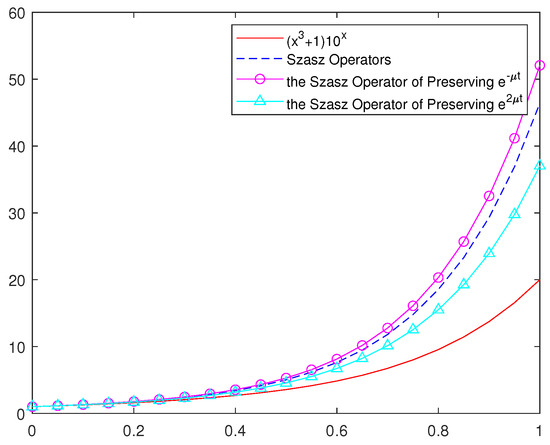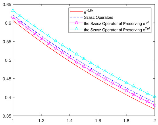 In order to more intuitively understand the approximation effect of classic Szsz operators and several new Szsz operators acting on functions, in this section, we will draw some graphs of different values of and different values of n with the help of Matlab software. Figure 3 and Figure 4 show the approximation of , i.e., the Szsz operators of preserving to the function , where and n take different values; Figure 5 and Figure 6 show the approximation of , i.e., the Szsz operators of preserving to the function , where and n take different values; Figure 7 and Figure 8 show the approximation of the classic Szsz operators, the new Szsz operators of preserving , to the functions and . At the same time, the root mean square errors of their approximation are calculated (See Table 1 and Table 2).