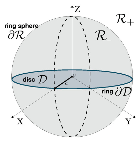 The equation of the disc in coordinates is , , and . The equations , describe its boundary, the ring , see Figure 2. This figure also shows a sphere of radius a. On its surface, and . Inside the sphere (in the region ), one has , while outside (in the region ) one has .