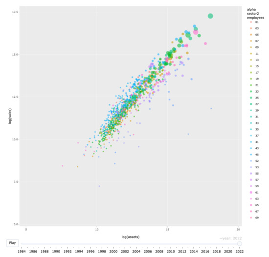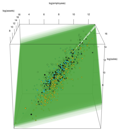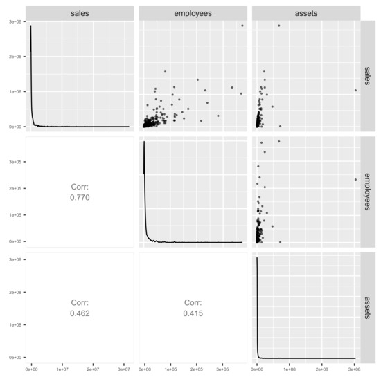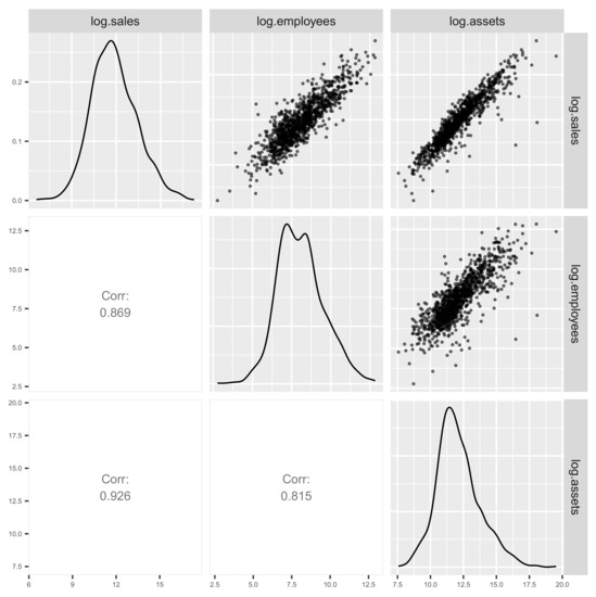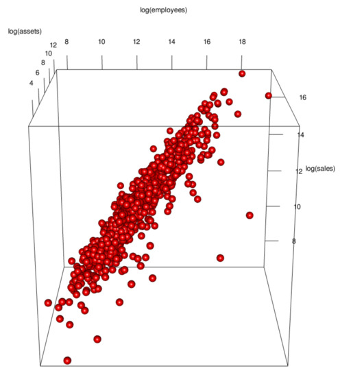 A preliminary effort that underlies this paper is [3]. They analyzed a data set of the Nikkei NEEDS financial data (https://needs.nikkei.co.jp (accessed on 9 September 2023)), extracted from a database system [4]. There are over 1500 Japanese firms in the data set, and they are listed in the first section of the Tokyo Stock Market. They fit a log-log model (will be defined in Section 4.1) with the normal error fitted to the sales as the response variable and the number of employees and the total assets as the explanatory variables, based on the results of the data visualization.