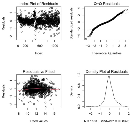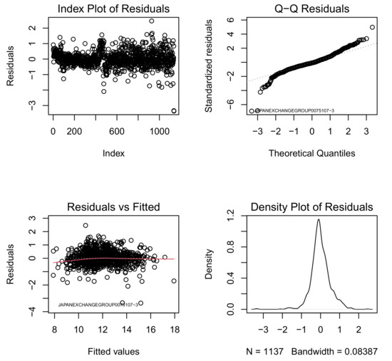 However, looking at the normal Q-Q plot of the residuals in the regression diagnostic plots (Figure 9), it is questionable whether the residuals follow a normal distribution at the bottom, which makes the normality of the error doubtful. This phenomenon was also observed in [3], but the discussion was insufficient. In this paper, we consider an explanation of this problem by some models that assume errors following asymmetric families of distributions, such as the skew-normal (SN) and skew-t (ST) distributions treated in [5]. For details, see [20,21].