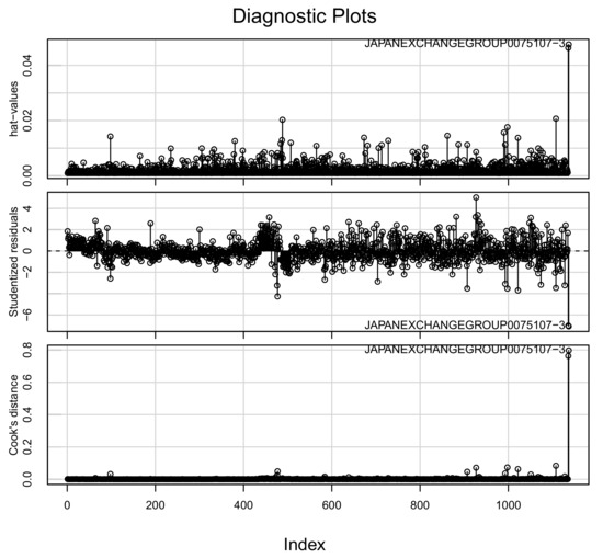 However, the plot of regression diagnostics (Figure 7) indicate the existence of some influential data. In general, the analysis to detect influential data is called sensitivity analysis, and special indicators and plots have been proposed. Here, we give index plots of the most basic ones: the hat values, the Studentized residuals, and the Cook’s distances (Figure 8). For details, see [19,28].
