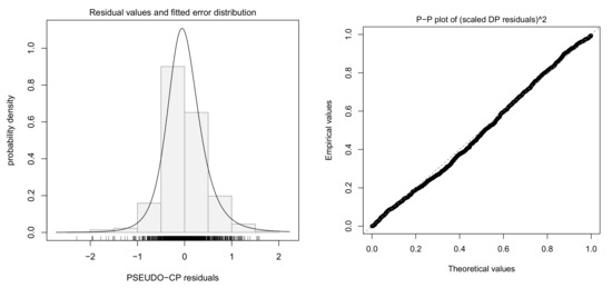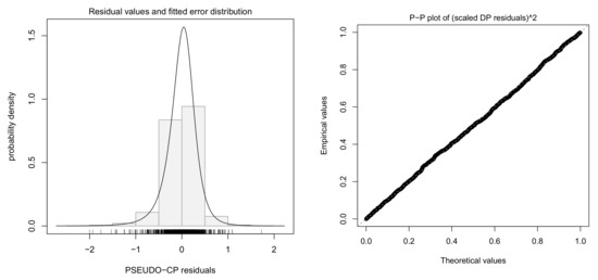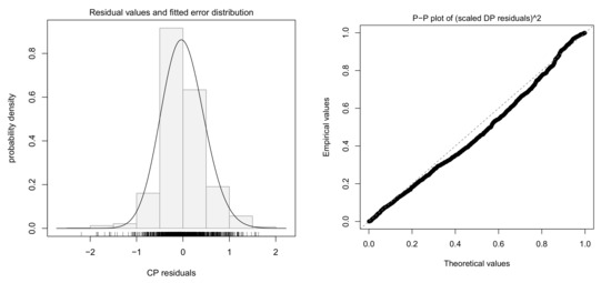 Histogram of CP residuals and statistical model (left panel); P-P plot of squared scaled DP residuals (right panel).