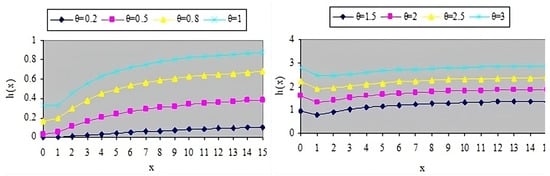 The hazard rate function has an increasing curve with respect to x when and , while it has a decreasing curve for and ; see Figure 1.