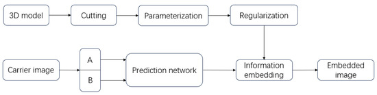 The schematic diagram of the entire project is shown in Figure 1. We cut, parameterize, and regularize the 3D model to obtain the results for embedding. For the carrier image, we predict it through the proposed convolutional neural network, find points that can embed information, and finally embed the processed 3D model.