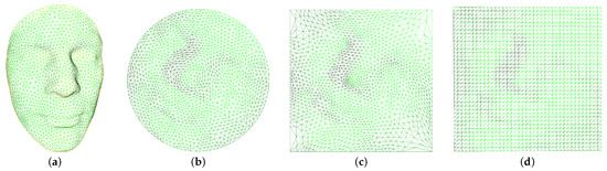 To demonstrate the regularization process of triangular mesh data clearly, we have selected a three-dimensional model with a low resolution. Figure 2 illustrates the process of regularization of a triangular mesh. The original model is denoted as Alex (a), and the area-preserving mapping obtained by the Alex model using Algorithm 1 is denoted as (b). It can be observed that after the area-preserving mapping, the vertices in the three-dimensional space are mapped to the two-dimensional parameterization to obtain the parameterized result of (a), and the surface area remains unchanged during the mapping process. The result after mapping the boundary of the parameterized result (b) to the boundary of the square is represented as (c), and the regularization result calculated by Algorithm 2 is represented as (d). After a series of mappings, we can fix the disordered triangular mesh data into a regular mesh of the two-dimensional parameter domain, which is similar to the data structure of a two-dimensional image. This data structure will be embedded in the two-dimensional carrier image as secret information in the following calculations.