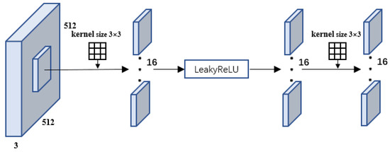 The prediction process is the same for each dimension, and, in this section, we describe the prediction process for the 3 × 3 convolution kernel dimension, as shown in Figure 4. The input is a 512 × 512 resolution, 3-channel RGB image. Sixteen 3 × 3 × 3 filters are used to convolve the input image, resulting in a feature map with a depth of 8. Appropriate padding is selected during convolution to maintain the resolution of the feature map as the input image. Then, the feature map is passed through a LeakyReLU activation function and finally through a 3 × 3 × 3 size and padding 1 convolution kernel, yielding the feature extraction result.