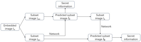 Then, use Formula (12) to embed into the carrier image, where represents the pixel values of the original subset image , resulting in the embedded image . Next, use the image to predict and generate image , and repeat the above embedding process to obtain image . Finally, concatenate images and to obtain image , which contains the secret information.