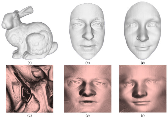 The experiment utilized three-dimensional models, namely the Bunny model (a), Luke model (b), and Sophia model (c). Their respective regularization results are labeled as (d) for the Bunny model, (e) for the Luke model, and (f) for the Sophia model.