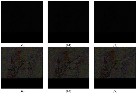 Differential images of embedding Luke, Sophia, and Bunny models into Lena images. (a1) represents the differential image of the difference before and after embedding Luke model into Lena image, (b1) represents the differential image of the difference before and after embedding Sophia model into Lena image, (c1) represents the differential image of the difference before and after embedding Bunny model into Lena image. (a2,b2,c2) represent the images obtained by multiplying the pixel values of (a1,b1,c1) by 10, respectively.