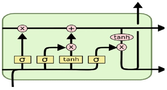 The primary feature of LSTM networks is the replacement of the hidden layer in traditional RNN networks with a memory module, as illustrated in Figure 3. The memory module included a cell, which serves as a storage location for the current state of the hidden layer. Additionally, there were three important gate units within the memory module that control the input, output, and forgetting of the cell through multiplication units. The dashed line in the figure represents the “peephole connection,” which indicates that the gate units adjust their controls based on the current state of the Cell. Unfolding the LSTM network revealed the flow of signals between the memory module and the gate units, as depicted in Figure 4. Using this model for training, under ideal conditions, it was possible to achieve absolute memory updates and forgetting by replacing the activation function of the gating unit.