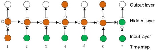 The design of the gate unit enabled the LSTM memory module to store and access information from a long time ago, thereby alleviating the problem of vanishing gradients. For example, as long as the input gate remains closed, the state of the cell will not be overwritten, allowing the state from a long time ago to influence the output far into the future. Figure 5 illustrates the process of gradient preservation in LSTM, where the “○” and “−” in the hidden layer represent the fully open and fully closed states of each gate unit, respectively. It can be seen that from the first input entering the memory module until the seventh step, the input gate remained closed and the forget gate was fully open, meaning that the cell retained 100% of its memory This is shown as orange circles in Figure 5 [11,12,13]. Therefore, even if there are new inputs later on, the state of the cell will not be overwritten and the state of the first input can be obtained at any time by opening the output gate. At the seventh step, the input gate was fully open and the forget gate was closed, causing the cell to forget its previous memory and update its state. Figure 5 analyzes an extreme example, as the activation function of the gate unit is the sigmoid function, which ranges from 0 to 1 and rarely reaches the extremes of “0” or “1”. As a result, the state of the cell will always be slowly forgotten or updated [14,15,16].