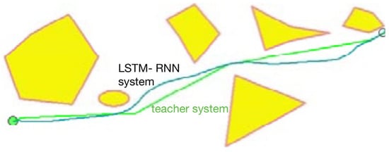 Figure 6 is experimental scenario 1, which shows the dynamic planning effect of LSTM-RNN and the teacher system in a static unknown environment. It can be seen that LSTM-RNN learned to avoid obstacles in static unknown environments, and the heading change was quite smooth.